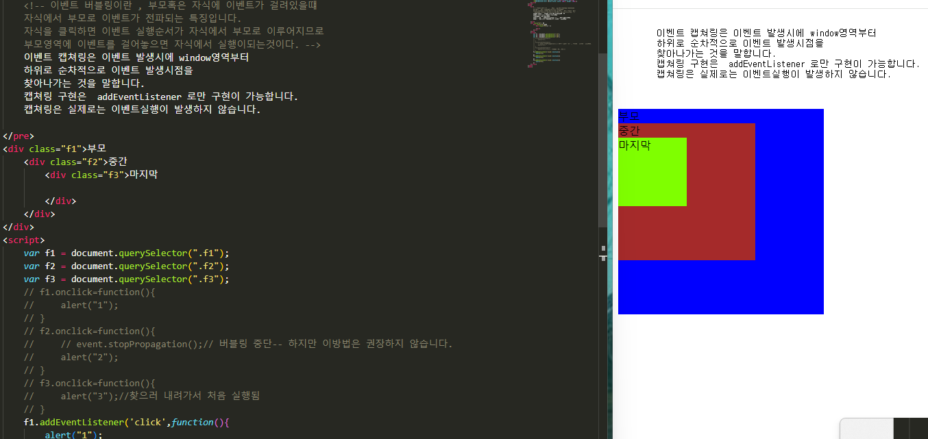-- 클릭을 누름과 동시에 모든 영역에서 탐색이 들어가서 누른 곳을 찾습니다. -- 이것을 캡쳐링이라고 합니다.