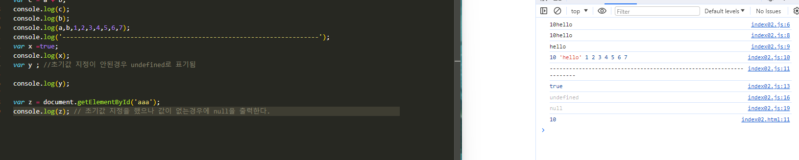 -- undefined 변수선언은 이루어졌으나 초기값지정을 하지 않은 경우 자동저장됩니다.